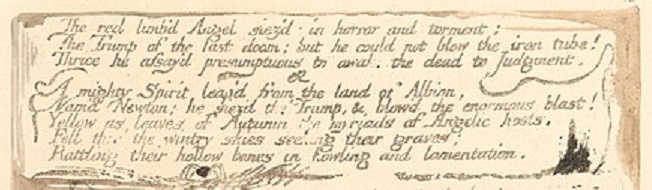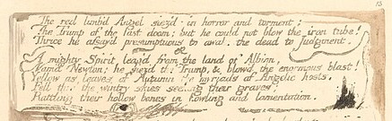 The red limb'd Angel siez'd, in horror and torment; The Trump of the last doom; but he could not blow the iron tube! Thrice he assay'd presumptuous to awake the dead to Judgment. A mighty Spirit leap'd from the land of Albion, Nam'd Newton; he siez'd the Trump, & blow'd the enormous blast!