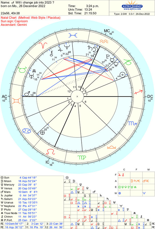 You are Mercury and Moon, new job is represent by the ruler of the 2nd sign in 10th house, Jupiter. Unfortunately we do not have aspect between rulers so I think answer on your question is No. Both Moon and Saturn/current job are in fixed sign that is one more testimony that the job will not change.------------------ Goca IP: Logged |