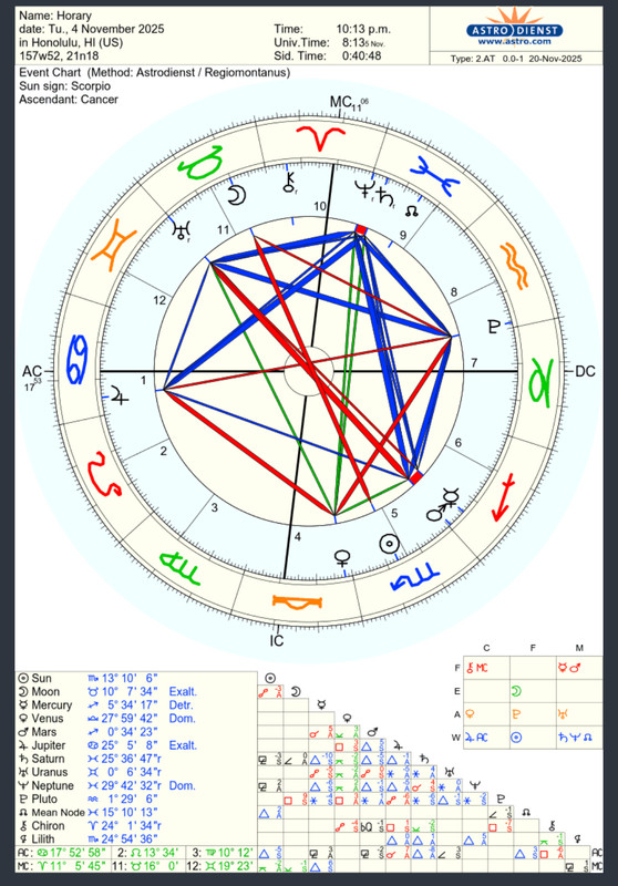 Thanks @Horary Fairy - all rings true especially the communication aspect. Question, so Jupiter doesn’t represent me? I was reading that planets in the first house also represent the querent. Though I think as the trine happens Saturn is retrograde and then Jupiter goes retrograde as Saturn comes out of it. What does Jupiter represent here? Or in general a planet in the first house? With appreciation. IP: Logged |